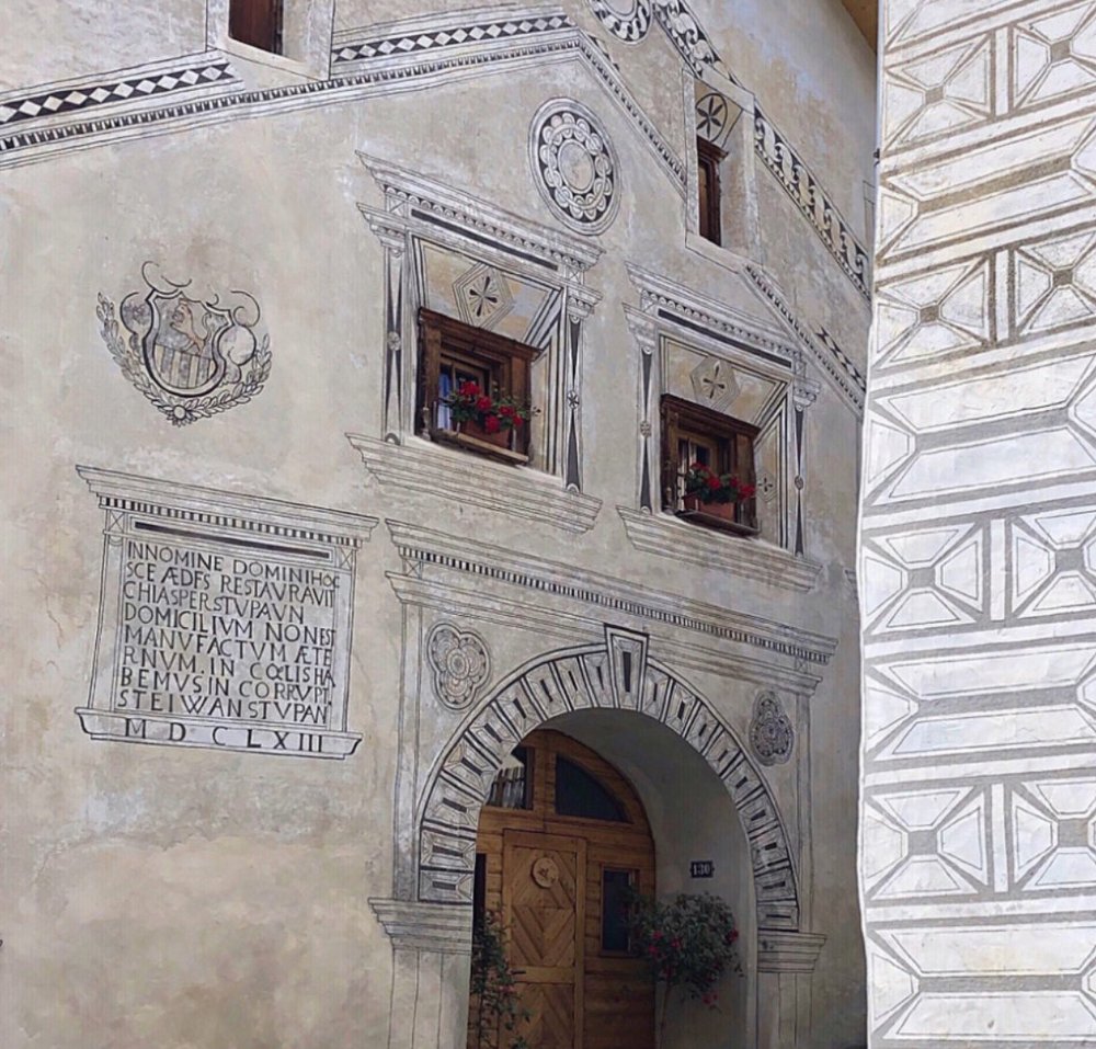 Sie tragen tiefe Bedeutungen. Meist schmücken sie Portale, Fenster, Giebel und Ecken von Gebäuden, selten aber ganze Fassaden. Typischerweise sind sie abstrakt gehalten, oft als Bänder mit Dreiecken oder Zirkelornamenten. Jedes Motiv hat eine symbolische Bedeutung. Das Doppelwellenband, auch "Laufender Hund" genannt, symbolisiert das Leben und die Lebenslinie.
